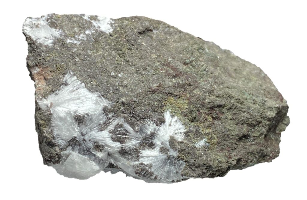 - Iwate: At Arasawa (Arasawa-mura), white transparent mordenite fibres to 5cm long, sometimes in cotton-like aggregates, fill amygdules in rhyolite-liparite. Some specimens are the most beautiful mordenites in Japan, as hemispherical sprays of silky white hairs to 5cm long, associated with minor quartz crystals. Microfibrous silky mordenite also composes much of a laminated or thinly bedded brownish white rock formed from altered volcanich ash.